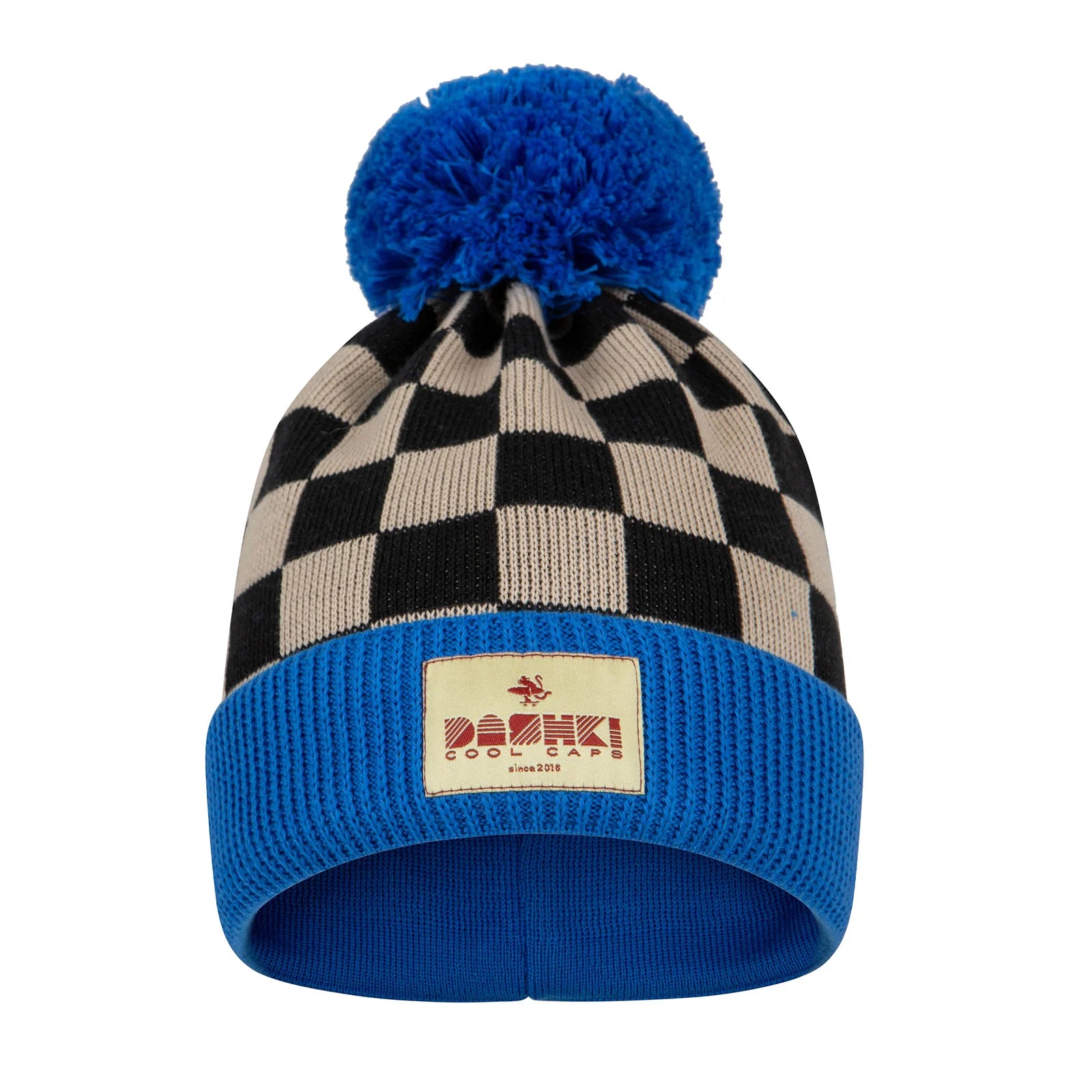 Klasyczna szachownica z czarnych kwadratów na beżowym tle to duet, który nigdy nie wychodzi z mody. A do tego te kobaltowe dodatki – małe, ale zadziorne! To one dodają pazura i sprawiają, że czapa ma swój charakter i klimat.