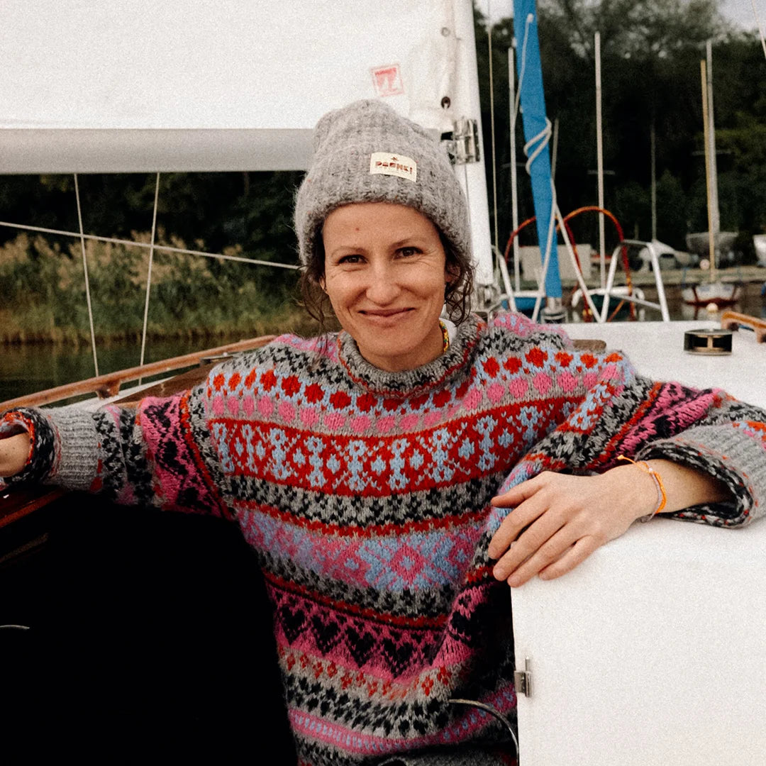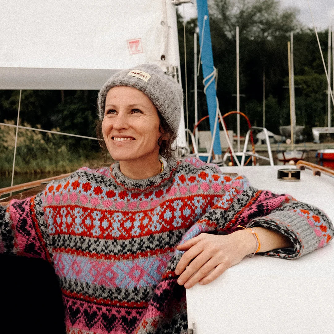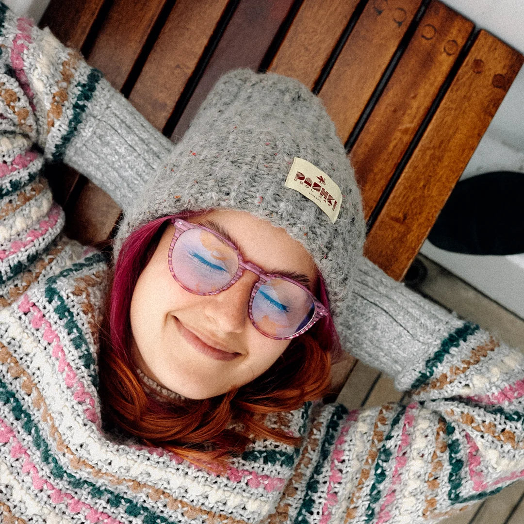Wykonana z najlepszej przędzy – połączenia alpaki, jedwabiu i wełny – jest miękka, gruba i przyjemnie mięsista. Jej obfity, gęsty splot w kolorach szrości wygląda, jakby był utkany z czułości i troski. A gdy przyjrzysz się bliżej… zauważysz drobne, kolorowe niteczki, które subtelnie błyszczą w świetle niczym mini tęcza – trochę jakby wpleciono w nią odrobinę magii...